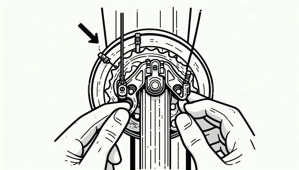 - もう片方の手で、タイヤをブレーキパッドの間にうまく滑り込ませる。